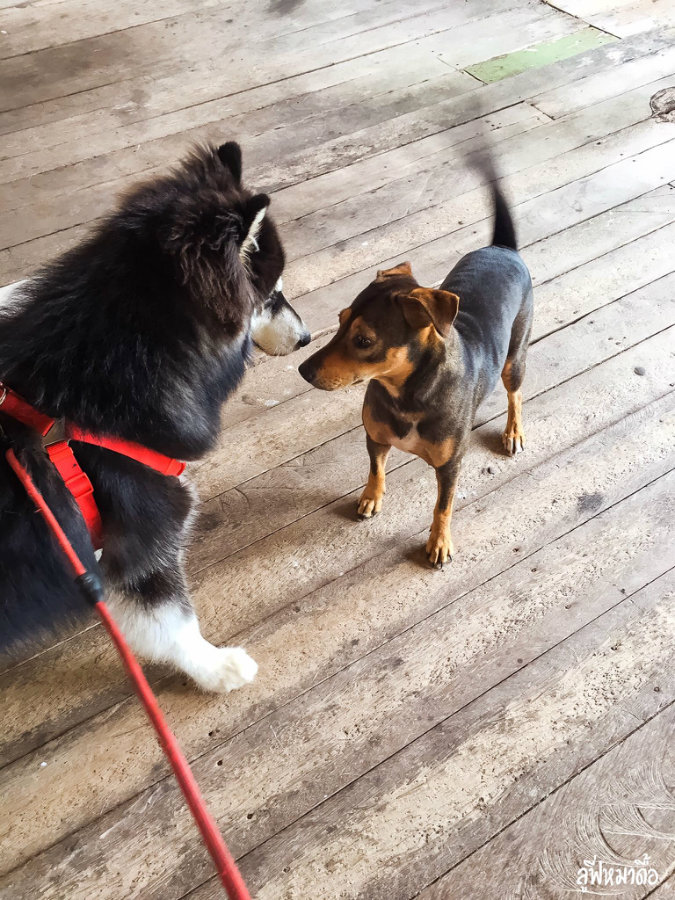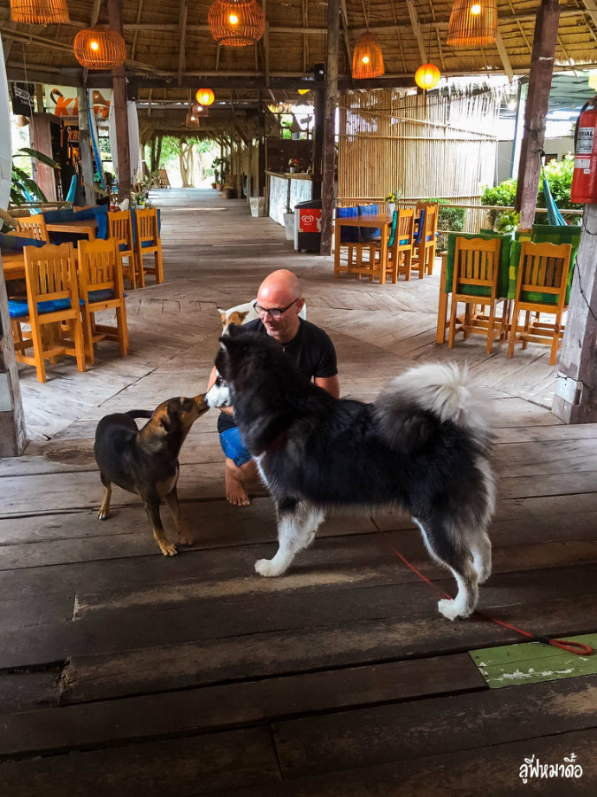แต่ต้องระวังหน่อย ที่นี่มีเจ้าถิ่นเป็นสุนัขพันธ์ไทย ชื่อกะทิ(เพศผู้) และ น้ำหวาน(เพศเมีย) ซึ่งเป็นหมาของเจ้าของรีสอร์ท ให้ดมๆกันสักพัก ก็ไม่มีปัญหาอะไร