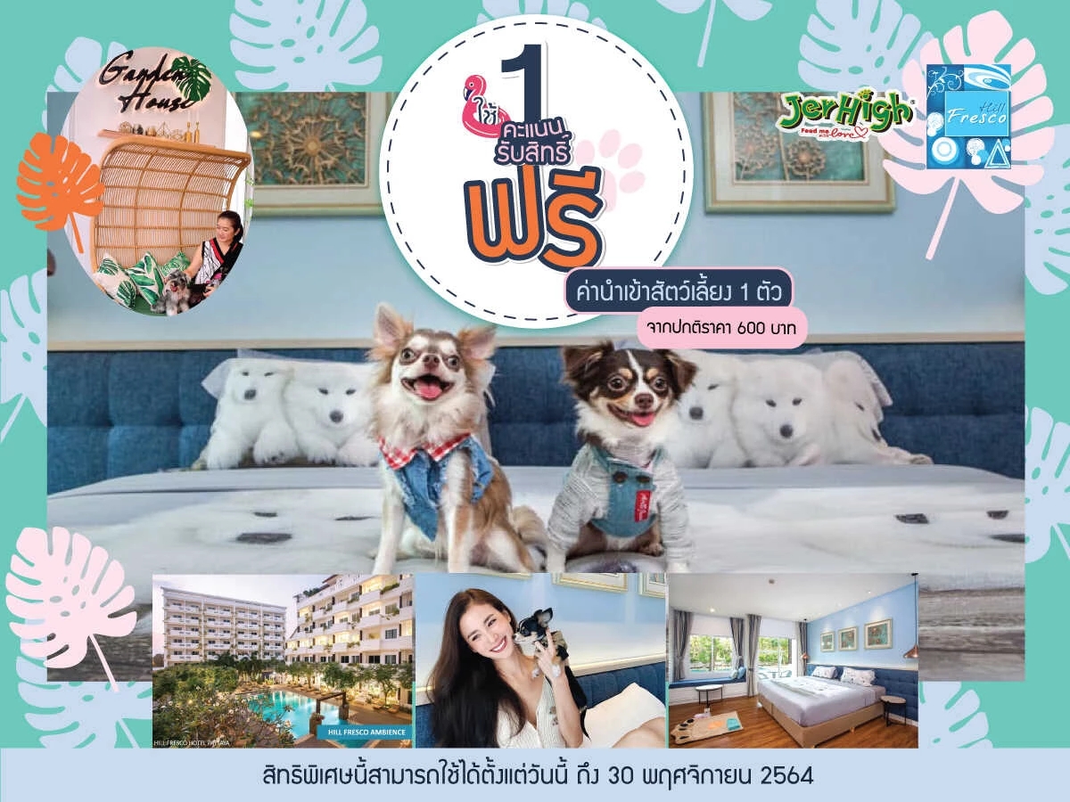 Jerhigh x Hill Fresco Hotel Pattaya โรงแรมหมาสัตว์เลี้ยงพักได้ พัทยา ฟรี!ค่านำเข้าสัตว์เลี้ยง ถึง 30 พฤศจิกายน 2564 มีบริการเบาะนอนน้องหมาและขนมแถมฟรีให้อีกด้วย |