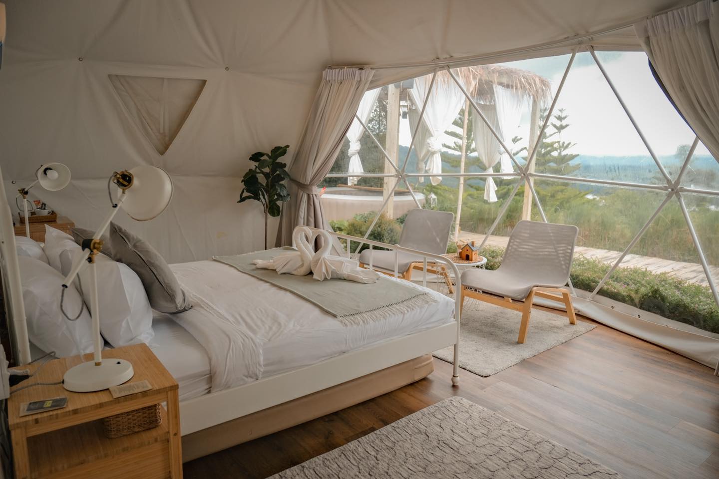 ห้องพัก หลายสไตล์ให้เลือก รถบ้าน เต็นท์ และ โดม มีตู้เย็นและ แอร์ นอนสบาย ห้องน้ำส่วนตัวทุกห้อง