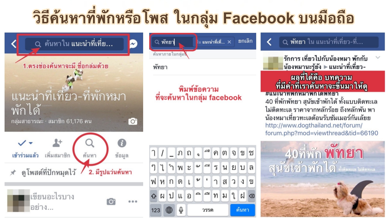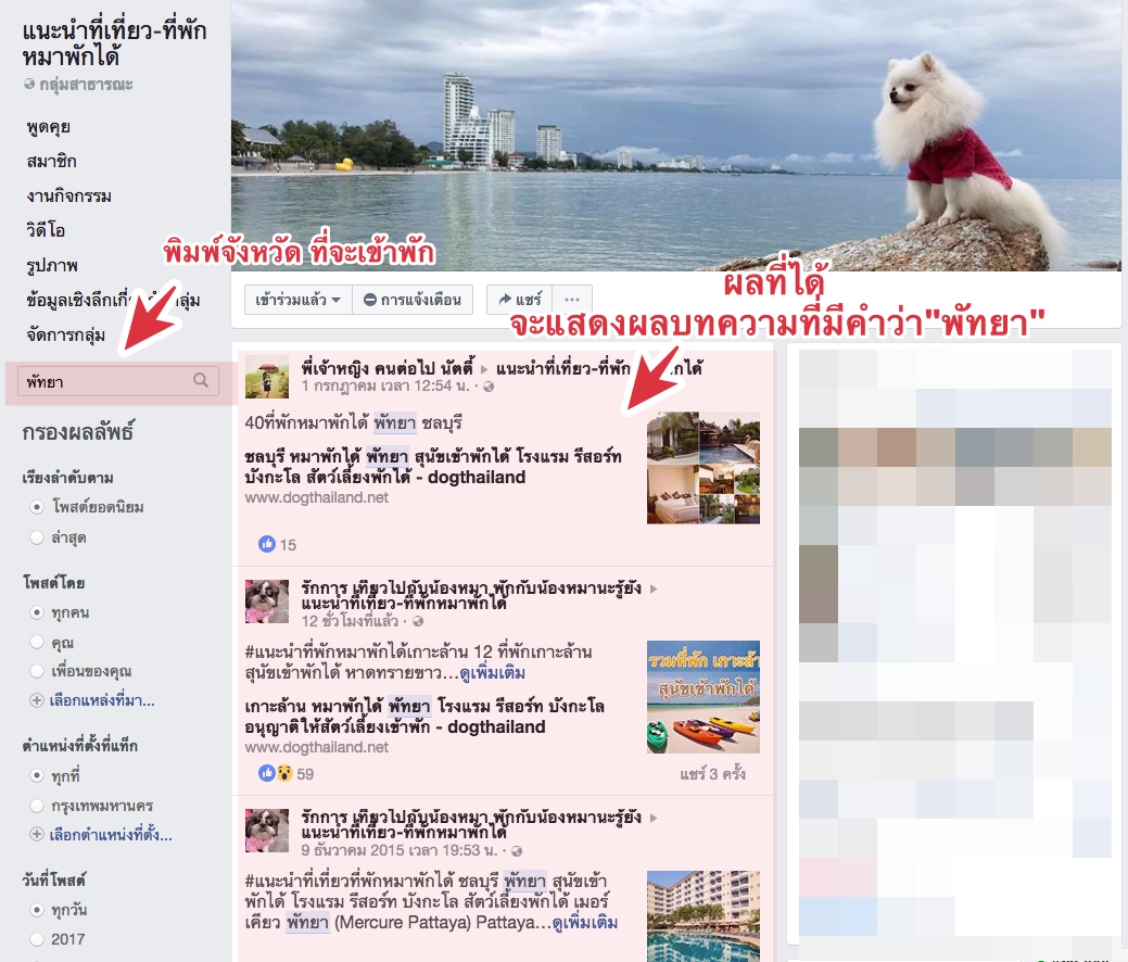วิธีค้นหาทีพัก ในกลุ่มแนะนำทีเที่ยว-ที่พักหมาพักได้ ในเฟสบุ๊ค |