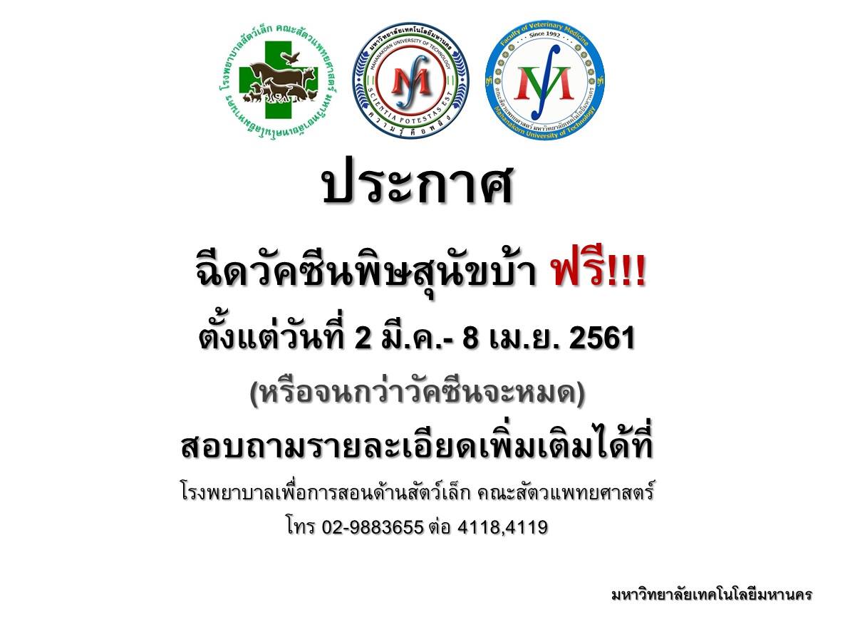 ฉีดวัคซีนพิษสุนัขบ้าฟรี 2 มี.ค. - 8 เม.ย 2561 ที่โรงพยาบาลสัตว์เล็ก ม.เทคโนโลยีมหานคร กทม. |