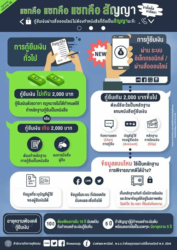 ***แล้วทุกคนรู้หรือไม่ว่า “การกู้ยืมเงินเกิน 2000 บาท ที่ไม่ได้ทำเป็นหนังสือผ่านสื่อออนไลน์ก็ถือเป็นสัญญานะจ๊ะ” สามารถนำไปใช้เป็นหลักฐานในการฟ้องคดีตามกฎหมายได้ด้วยนะครับ สอบถามเพิ่มเติม : สำนักงานคณะกรรมการธุรกรรมทางอิเล็กทรอนิกส์ โทร 021416985-99