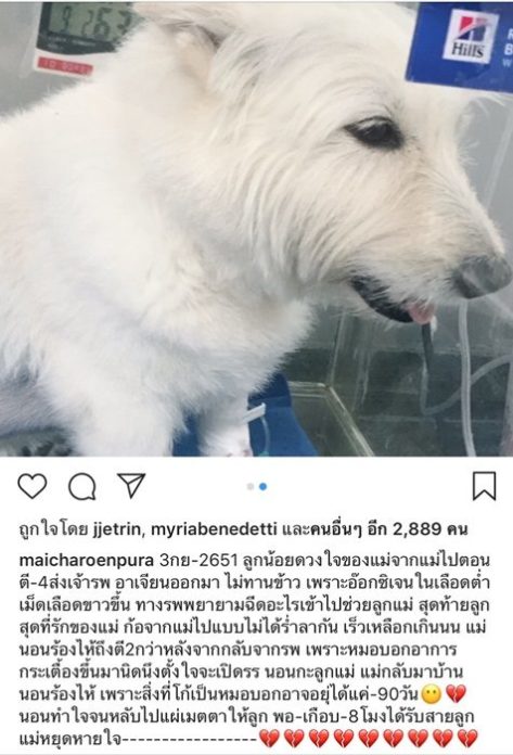 ใหม่ เจริญปุระ โพสต์รูปที่ถ่ายคู่กับ น้องตะโก้ น้องหมาสุดที่รัก ที่เสียชีวิต ลงในอินสตาแกรมส่วนตัว ที่ใช้ชื่อว่า maicharoenpura โดยมีข้อความว่า “3 กย-2651 ลูกน้อยดวงใจของแม่ จากแม่ไปตอนตี -4 ส่งเจ้ารพ อาเจียนออกมา ไม่ทานข้าว เพราะอ๊อกซิเจนในเลือดต่ำ เม็ดเลือดขาวขึ้น ทางรพพยายามฉีดอะไรเข้าไปช่วยลูกแม่ สุดท้ายลูกสุดที่รักของแม่ ก้อจากแม่ไป แบบไม่ได้ร่ำลากัน เร็วเหลือกเกินนน แม่นอนร้องไห้ถึงตี 2 กว่า หลังจากกลับจากรพ เพราะหมอบอกอาการกระเตื้องขึ้นมานิดนึง ตั้งใจจะเปิดรร นอนกะลูกแม่ แม่กลับมาบ้าน นอนร้องไห้ เพราะสิ่งที่โก้เป็นหมอบอกอาจอยุ่ได้แค่ -90 วัน นอนทำใจจนหลับไปแผ่เมตตาให้ลูก พอ-เกือบ-8โมงได้รับสายลูกแม่หยุดหายใจ "