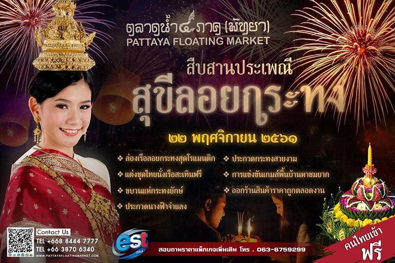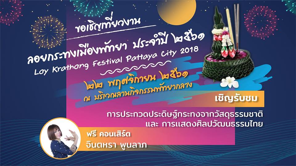 งานลอยกระทงเมืองพัทยา จังหวัดชลบุรี เชิญชวนเที่ยวงาน ประเพณีลอยกระทงเมืองพัทยา วันที่ 22 พฤศจิกายน 2561 ณ บริเวณลานกิจกรรมพัทยากลาง จังหวัดชลบุรี และร่วมกิจกรรมต่าง ๆ ที่น่าสนใจ ไม่ว่าจะเป็น การประกวดประดิษฐ์กระทง การแสดงศิลปวัฒนธรรมไทย ที่มีความสวยงาม เป็นแบบอย่างวัฒนธรรมไทยประจักษ์สู่สายตานักท่องเที่ยว พร้อมชมคอนเสิร์ตจากศิลปินลูกทุ่งชื่อดังฟรี!