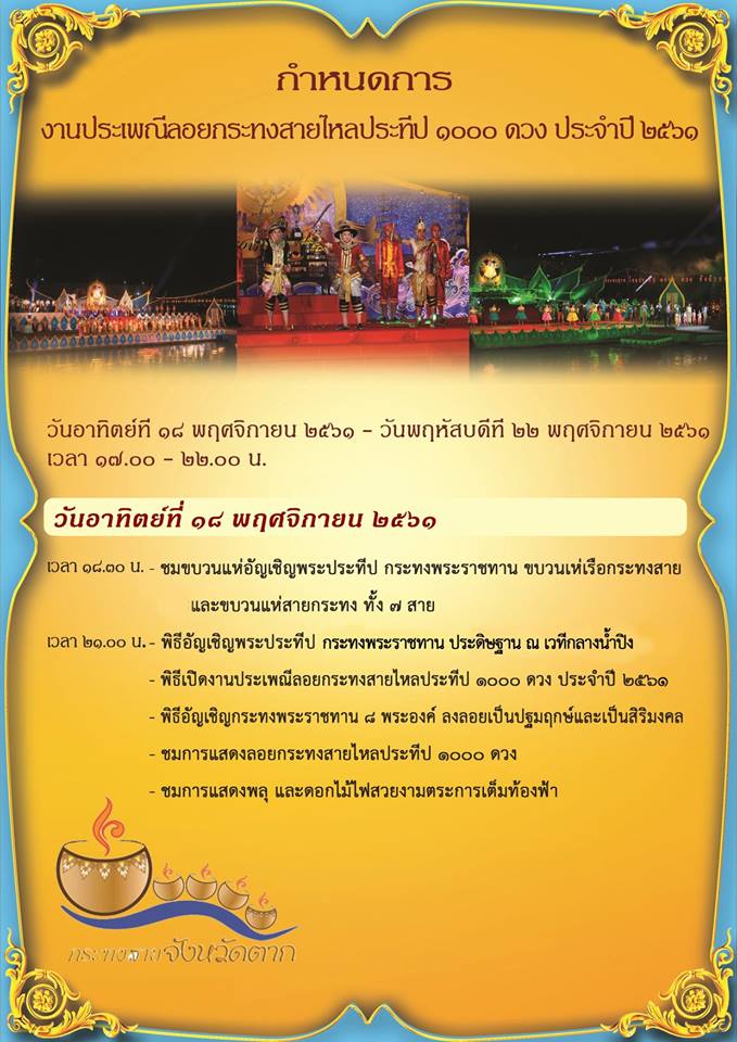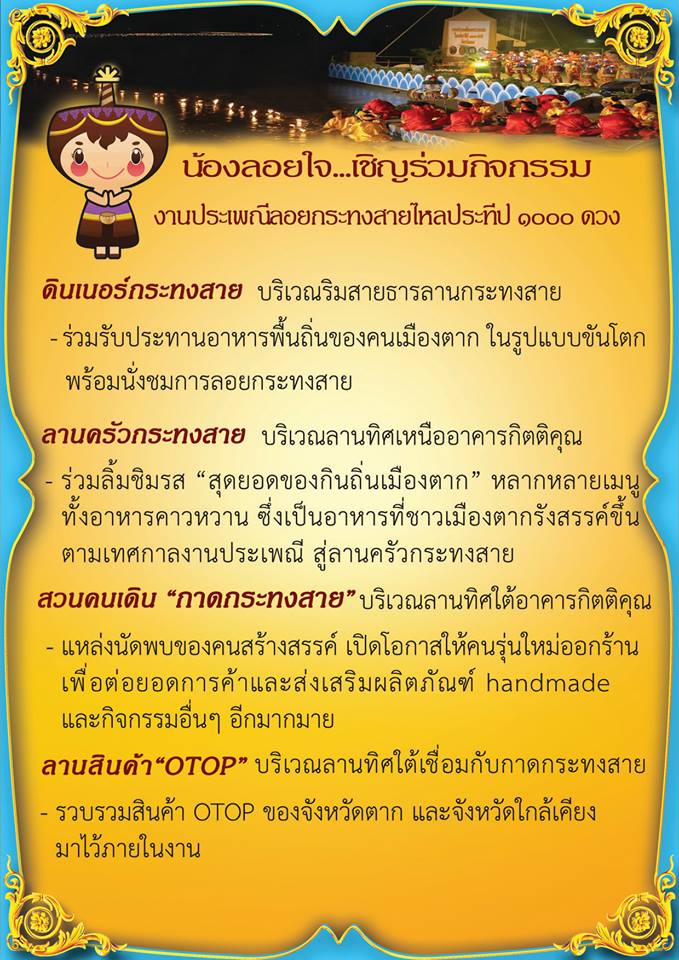 ประเพณีลอยกระทงสายไหลประทีป 1,000 ดวง จังหวัดตาก ประเพณีที่มีรูปแบบโดดเด่นเป็นเอกลักษณ์และสืบทอดกันมาช้านานตั้งแต่บรรพบุรุษ ซึ่งจะแตกต่างจากจังหวัดอื่นเพราะส่วนประกอบของกระทงที่ใช้กะลามะพร้าว ประกอบกับแม่น้ำปิงที่ไหลผ่านจังหวัดตากนั้นมีสันทรายใต้น้ำทำให้เกิดร่องน้ำตามธรรมชาติ เมื่อนำกระทงไปลอย จะพบว่ากระทงจะลอยต่อเนื่องกัน เห็นแสงไฟระยิบระยับจากกระทงเป็นสายยาวตามความยาวของร่องน้ำ อย่างสวยงาม โดยปีนี้กำหนดจัดขึ้นระหว่างวันที่ 18 – 22 พฤศจิกายน 2561 ณ ริมสายธารลานกระทงสาย เชิงสะพานสมโภชกรุงรัตนโกสินทร์ 200 ปี อำเภอเมือง จังหวัดตาก