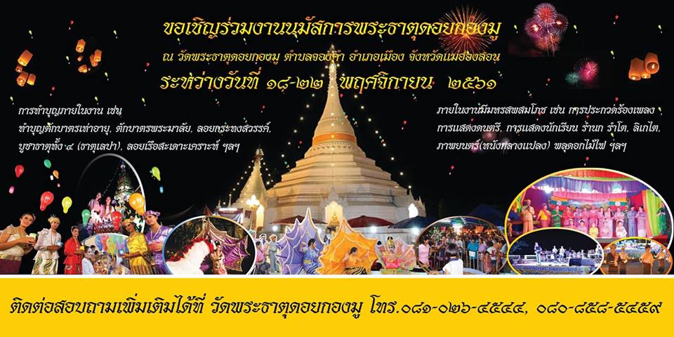 เชิญชวนทุกท่านเที่ยวงาน นมัสการพระธาตุดอยกองมู (ลอยกระทงสวรรค์) ระหว่างวันที่ 18-22 พฤศจิกายน 2561 ณ วัดพระธาตุดอยกองมู ตำบลจองคำ อำเภอเมือง จังหวัดแม่ฮ่องสอน ภายในงานมีการทำบุญต่าง ๆ เช่น การทำบุญตักบาตรเท่าอายุ, ตักบาตรพระมาลัย, ลอยกระทงสวรรค์, บูชาธาตุทั้ง 4, ลอยเรือสะเดาะเคราะห์ ฯลฯ นอกจากนี้ยังมีการจัดมหรสพสมโภช เช่น การประกวดร้องเพลง การแสดงดนตรีของนักเรียน, ลิเกไทยใหญ่, ภาพยนตร์, การประกวดดอกไม้ไฟ และกิจกรรมบันเทิงรื่นเริงอื่น ๆ อีกมากมาย