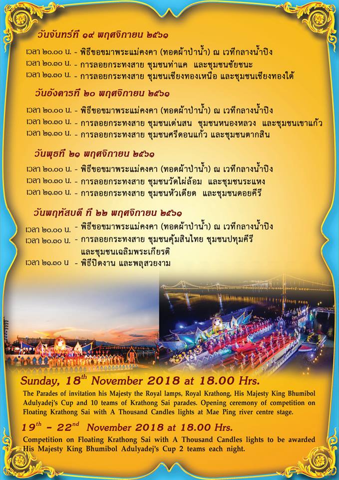 ประเพณียี่เป็ง จังหวัดเชียงใหม่ ประเพณียี่เป็ง หรือ ประเพณีลอยกระทงตามแบบล้านนา ปีนี้จัดขึ้นภายใต้แนวคิด “แอ่วยี่เป็งเจียงใหม่ ฮ่วมแฮงฮ่วมใจ๋ลดขยะ ปลอดประทัดยักษ์ ไร้แอลกอฮอล์” ตั้งแต่วันที่ 20 – 23 พฤศจิกายน 2561 โดยจัดให้มีกิจกรรม ต๋ามผางปะตี๊ด การประกวดขบวนแห่กระทงใหญ่ การแสดงพลุเฉลิมพระเกียรติฯ การแสดงประติมากรรมโคมไฟสีสันยี่เป็ง การประกวดหนูน้อยยี่เป็ง การแสดงศิลปวัฒนธรรมล้านนา และอีกหลากหลายกิจกรรม เอกลักษณ์อย่างหนึ่งของงานยี่เป็ง ที่ผู้มาเยี่ยมชมเฝ้ารอคอย นั่นก็คือ ภาพโคมนับร้อย ๆ ดวง ที่ค่อย ๆ ลอยส่องแสงสว่างอยู่เหนือท้องฟ้า