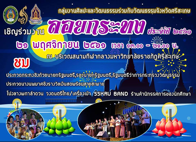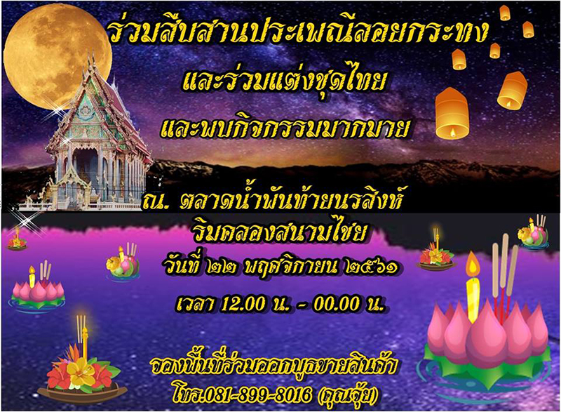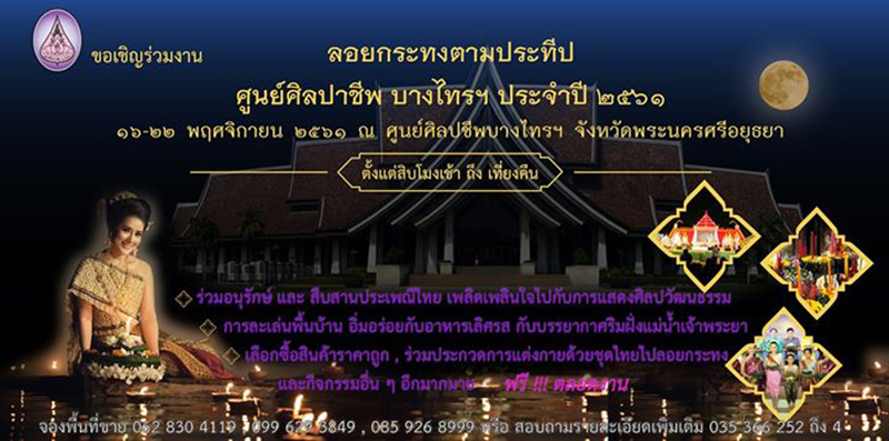 ศูนย์ศิลปาชีพบางไทร จังหวัดอยุธยา ศูนย์ศิลปาชีพบางไทร อยุธยา จัดงานวันลอยกระทง ระหว่างวันที่ 16 – 22 พฤศจิกายน 2561 เพลิดเพลินใจไปกับการแสดงศิลปวัฒนธรรม การละเล่นพื้นบ้าน การประกวดนางนพมาศ การประกวดกระทง ในบรรยากาศริมฝั่งแม่น้ำเจ้าพระยา อิ่มอร่อยกับอาหารเลิศรส เลือกซื้อสินค้าหัตกกรรมจากศูนย์ศิลปาชีพบางไทรฯ ร่วมประกวดแต่งกายด้วยชุดไทยไปลอยกระทง และกิจกรรมอื่น ๆ อีกมากมาย