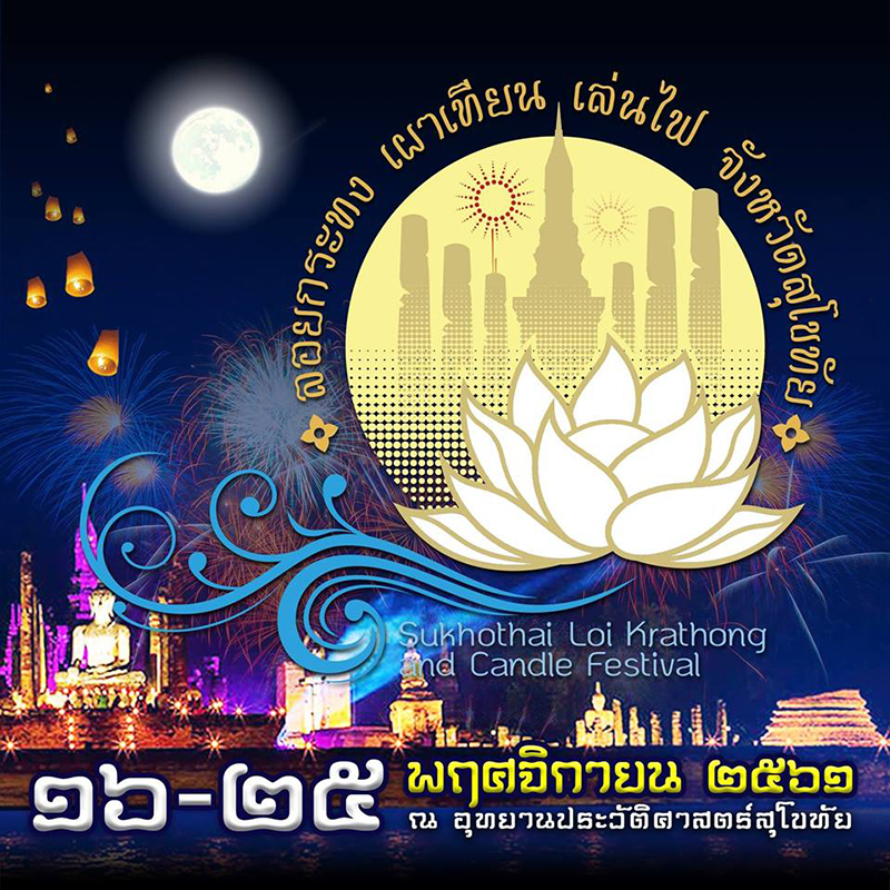จังหวัดสุโขทัย จัดขึ้นที่ อุทยานประวัติศาสตร์สุโขทัย เมืองมรดกโลกและเป็นต้นกำเนิดประเพณีลอยกระทง ระหว่างวันที่ 16 – 25 พฤศจิกายน 2561 ชมกระทงทรงพุ่มข้าวบิณฑ์ งานฝีมืออันวิจิตรที่สะท้อนความประณีตของช่างศิลป์เมืองสุโขทัย และพบกับกิจกรรมต่าง ๆ ที่น่าสนใจ ดังนี้ - พิธีตักบาตรรับรุ่งอรุณ