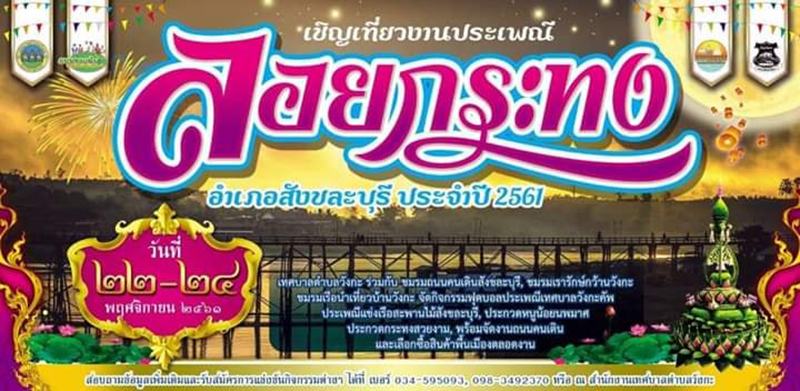 หากแต่สายน้ำแห่งอำเภอสังขละบุรี ยังเป็นอีกหนึ่งสถานที่ท่องเที่ยวที่มีการจัดงานประเพณีลอยกระทงได้อย่างน่าสนใจ สนุกไปกับกิจกรรมต่าง ๆ มากมาย ทั้งประเพณีแข่งเรือ, ประกวดหนูน้อยนพมาศ, ประกวดกระทงสวยงาม พร้อมจัดงานถนนคนเดิน ให้นักท่องเที่ยวได้เดินเลือกซื้อสินค้าพื้นเมืองกันตลอดงาน