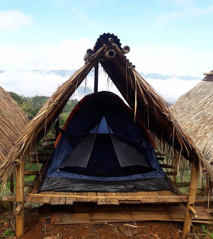 ที่พักมีซุ้มสำหรับกางเต็นท์ เต็นท์พร้อมนอน 1 เต็นท์ ราคาคืนละ 500 บาท พักได้ 2 ท่าน