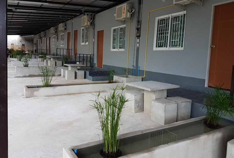 จอดรถหน้าบ้านได้ ห้องละ 1 คัน และมีลานจอดรถ จอดได้ 10 คัน