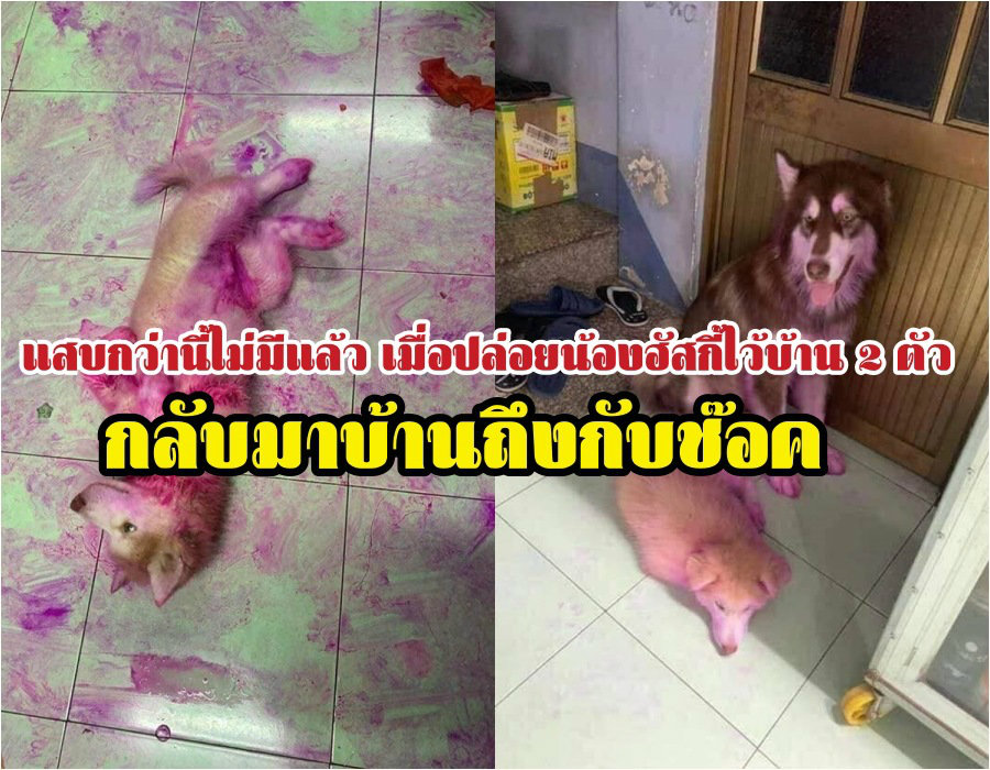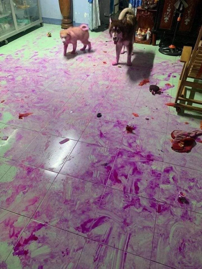 ล่าสุด วันที่ 9 สิงหาคม 2562 เว็บไซต์เวิลออฟบัซ รายงานว่า ผู้ใช้เฟซบุ๊กรายหนึ่งจากประเทศมาเลเซีย ได้แชร์ภาพชวนตะลึงอึ้ง เมื่อครั้งกลับมาถึงบ้าน พบว่าเจ้าตูบฮัสกี้ 2 ตัวที่ปล่อยให้อยู่ตามลำพังเพียงครู่เดียว ได้พากันเล่นซนกันกระจาย เปลี่ยนพื้นบ้านกลายเป็นสีม่วง รวมไปถึงขนของมันเองด้วย