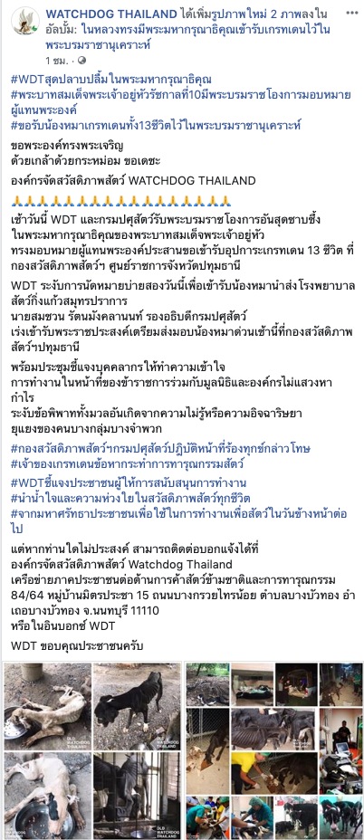 เช้าวันนี้ WDT และกรมปศุสัตว์รับพระบรมราชโองการอันสุดซาบซึ้ง ในพระมหากรุณาธิคุณของพระบาทสมเด็จพระเจ้าอยู่หัว  ทรงมอบหมายผู้แทนพระองค์ประสานขอเข้ารับอุปการะเกรทเดน 13 ชีวิต ที่กองสวัสดิภาพสัตว์ฯ ศูนย์ราชการจังหวัดปทุมธานี WDT ระงับการนัดหมายบ่ายสองวันนี้เพื่อเข้ารับน้องหมานำส่งโรงพยาบาลสัตว์กิ่งแก้วสมุทรปราการ นายสมชวน รัตนมังคลานนท์ รองอธิบดีกรมปศุสัตว์ เร่งเข้ารับพระราชประสงค์เตรียมส่งมอบน้องหมาด่วนเช้านี้ที่กองสวัสดิภาพสัตว์ฯปทุมธานี