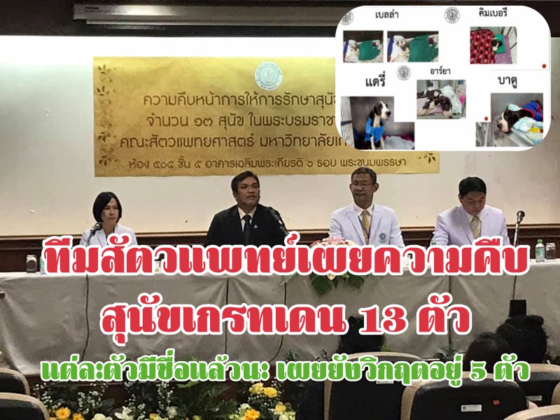 ทีมสัตวแพทย์เผยความคืบหน้าอาการ สุนัขเกรทเดน 13 ตัว แต่ละตัวมีชื่อแล้วนะ เผยยังวิกฤตอยู่ 5 ตัว