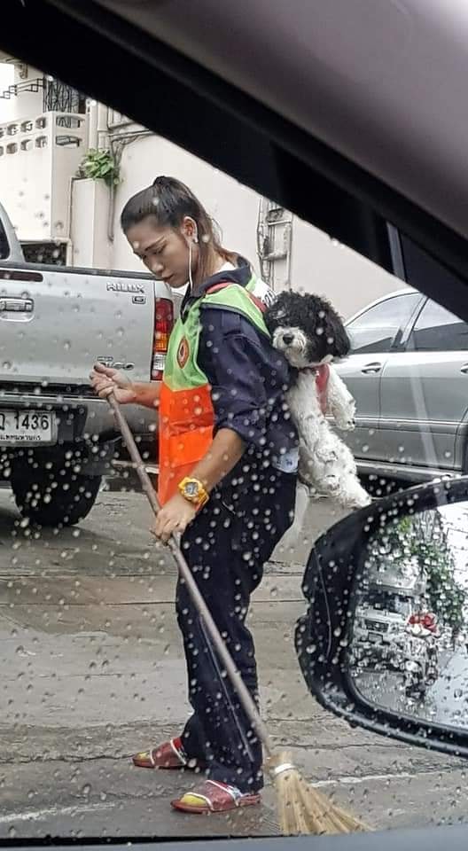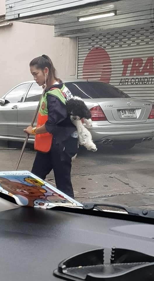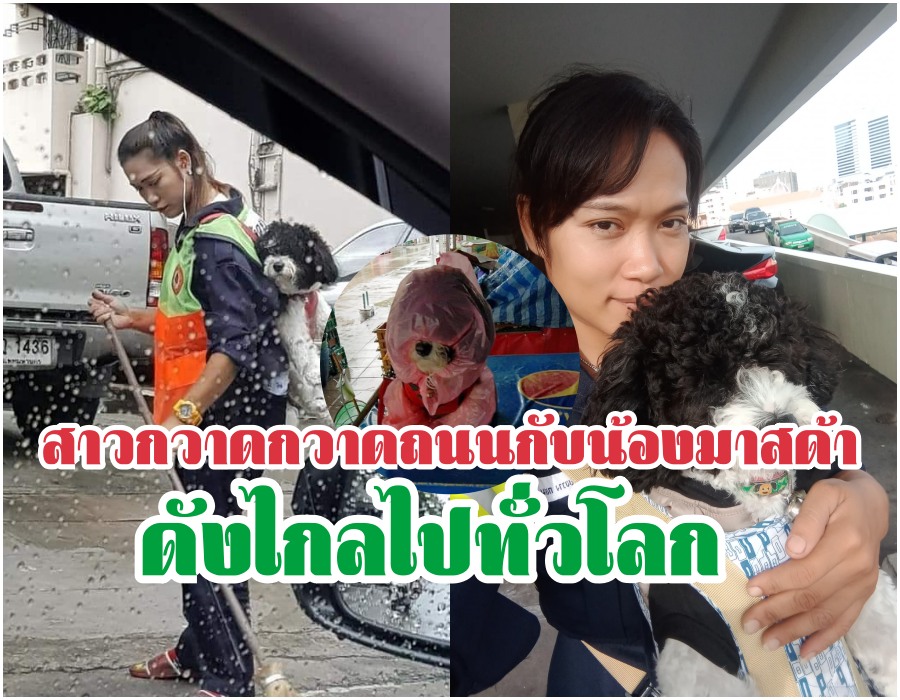 สาวกวาดกวาดถนนกับน้องมาสด้า พันธ์ชิสุ-พูเดิล ดังไกลไปทั่วโลก สื่อนอกตีข่าวแบกหมาทำงาน |