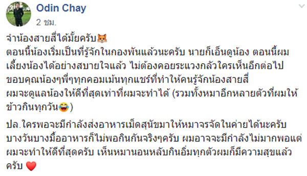 เรื่องราวดังกล่าวได้สร้างความประทับใจในโลกออนไลน์เป็นอย่างมาก ชาวเน็ตต่างเข้ามาชื่นชมทหารหนุ่มและเอ็นดูหมาน้อยกันท่วมท้น กระทั่งล่าสุด (2 กันยายน 2562) ทหารหนุ่มได้อัปเดตเรื่องราวดังกล่าว ว่า ตอนนี้ สายสี่ เริ่มเป็นที่รู้จักในกองพัน นายก็เอ็นดูน้อง และอนุญาตให้เลี้ยงได้ ขอบคุณโซเชียลที่ทำให้คนรู้จักสายสี่ ตนสัญญาจะดูแลน้องให้ดีที่สุด
