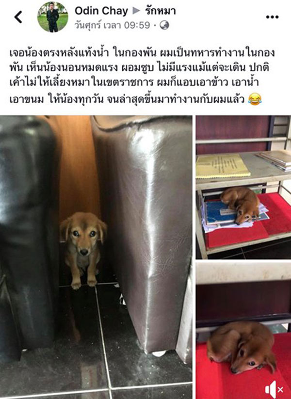 กลายเป็นเรื่องราวน่ารัก ๆ ของทหารหนุ่มกับหมาน้อย หลังเจ้าตัวได้โพสต์เล่าในกลุ่ม รักหมา เมื่อวันที่ 30 สิงหาคม 2562 พร้อมภาพลูกสุนัขตาแบ๊ว นั่งแอบอยู่ในซอกเก้าอี้ โดยทหารหนุ่มเล่าว่า เจอลูกสุนัขหลังแท็งก์น้ำในกองพัน สภาพหมดแรง ผอมซูบ