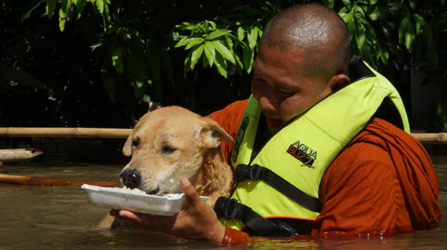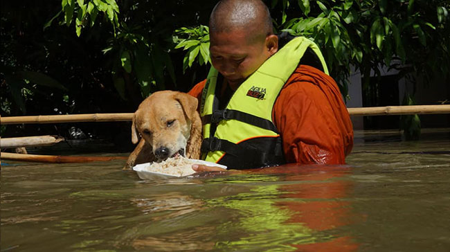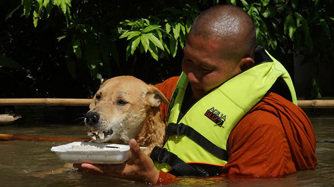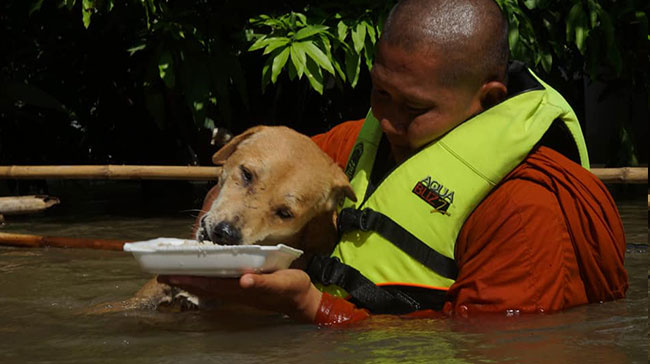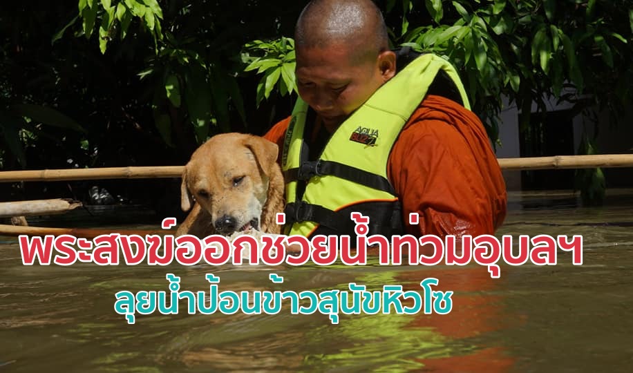 พระสงฆ์ออกช่วยน้ำท่วมอุบลฯ ลุยน้ำป้อนข้าวสุนัขหิวโซ ใกล้ตาย ไม่สนจีวรเปียก |