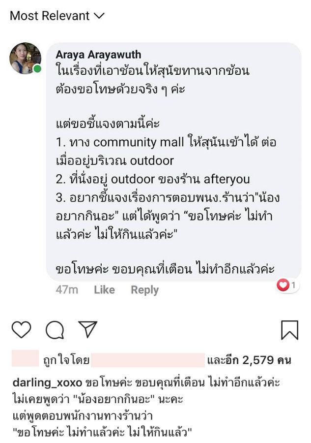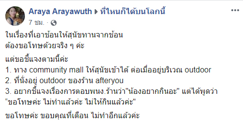 ล่าสุด (26 มกราคม 2563) พบว่าหญิงสาวในรูปดังกล่าวที่ถูกแชร์ คือ ดาร์ลิ่ง อารดา อดีตสมาชิกเกิร์ลกรุ๊ป วงชูการ์ อายส์ และพี่สาวของเธอ ซึ่งต่อมา อารยา ผู้เป็นพี่สาว ได้โพสต์เฟซบุ๊กขอโทษและชี้แจงเรื่องดังกล่าว โดยขอโทษที่ใช้ช้อนป้อนขนมสุนัข พร้อมเผยว่าทางศูนย์การค้าให้เอาสุขนัขเข้าไปได้ ต่อเมื่ออยู่บริเวณเอาต์ดอร์ ซึ่งที่ตนนั่งก็อยู่โซนเอาต์ดอร์ของร้าน
