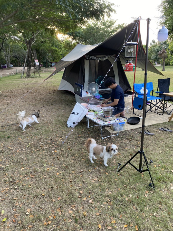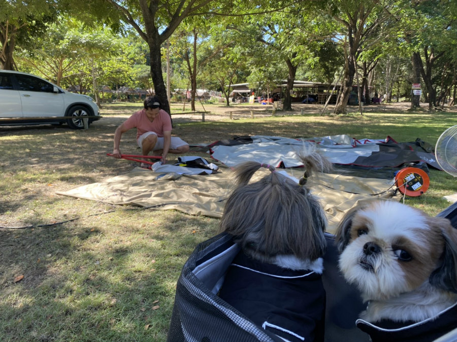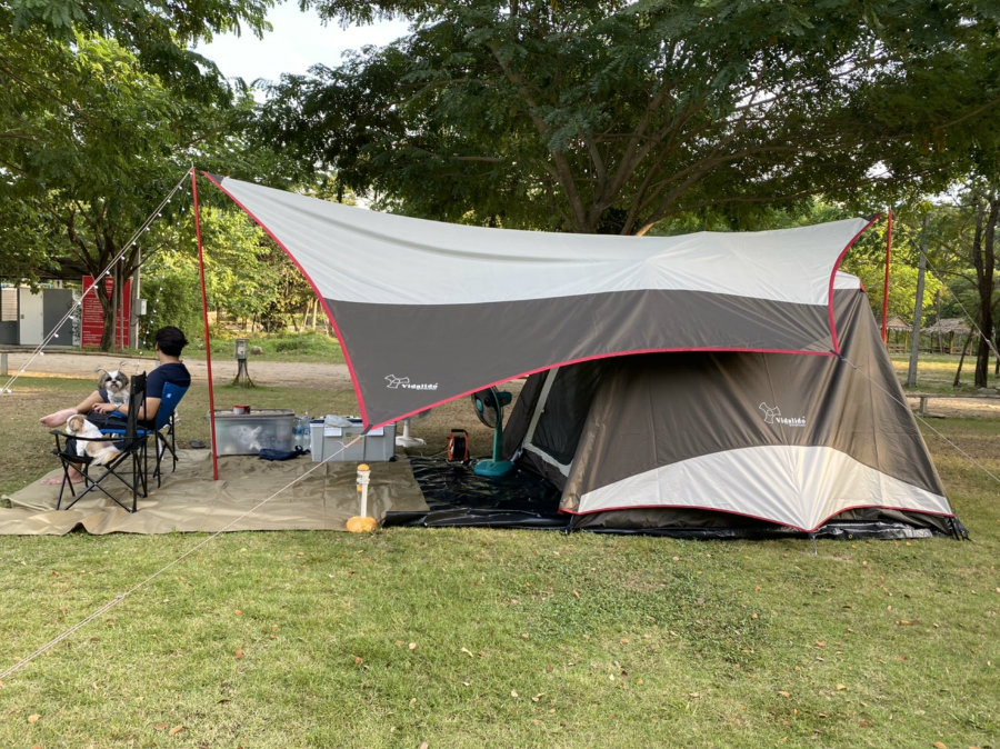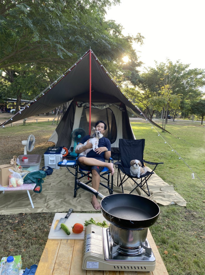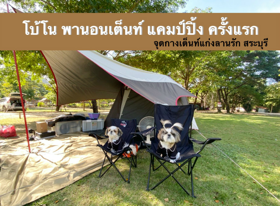 โบ้โน พานอนเต็นท์ แคมป์ปิ้ง ครั้งแรก วิวริมน้ำ ที่จุดกางเต็นท์แก่งลานรัก สระบุรี น้องหมาเข้าพักได้ด้วย |