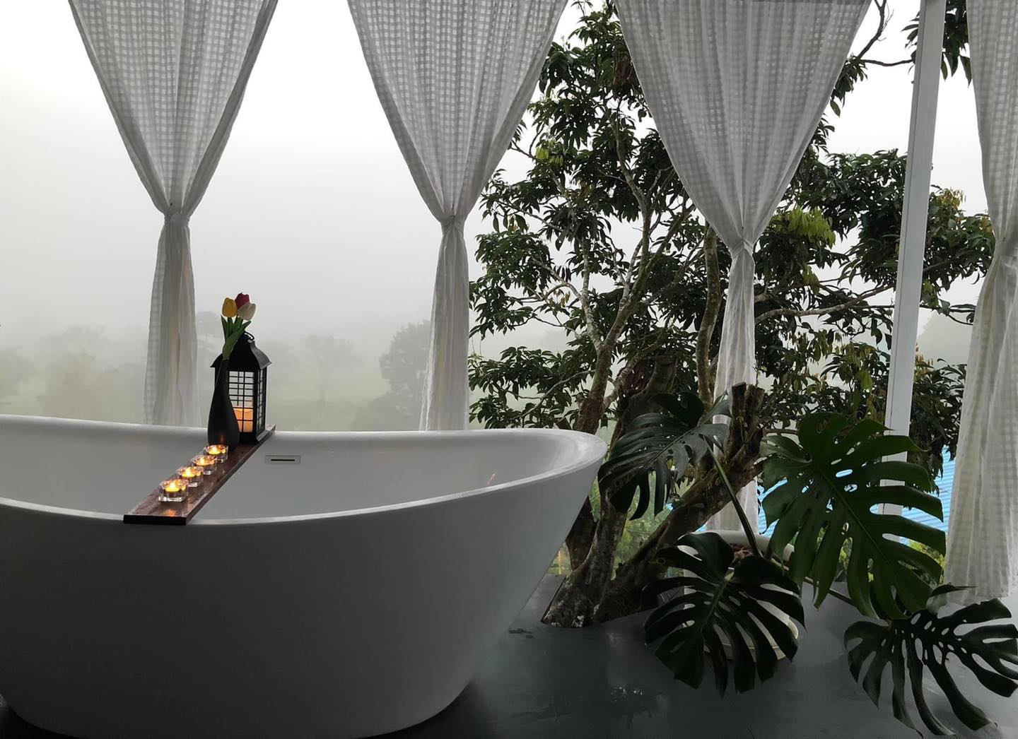 บ้านมีอ่างอาบน้ำ มีระเบียงหน้าบ้าน ชมวิวภูเขา