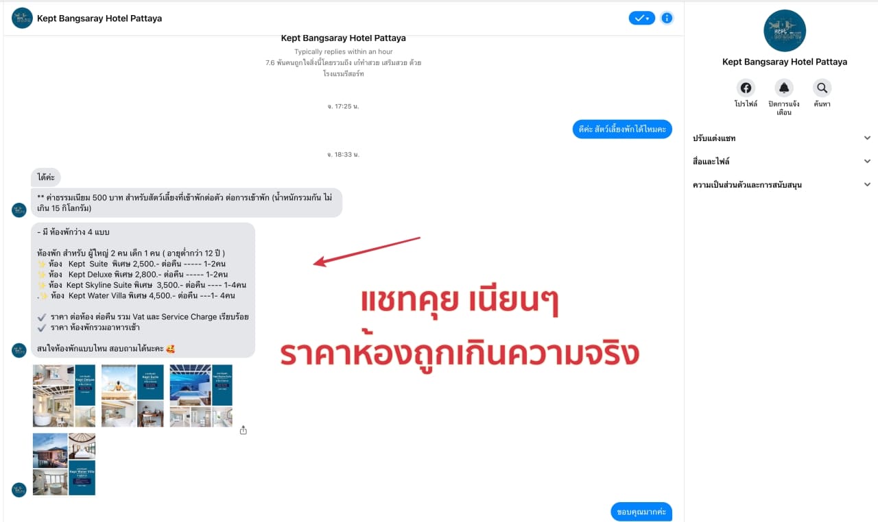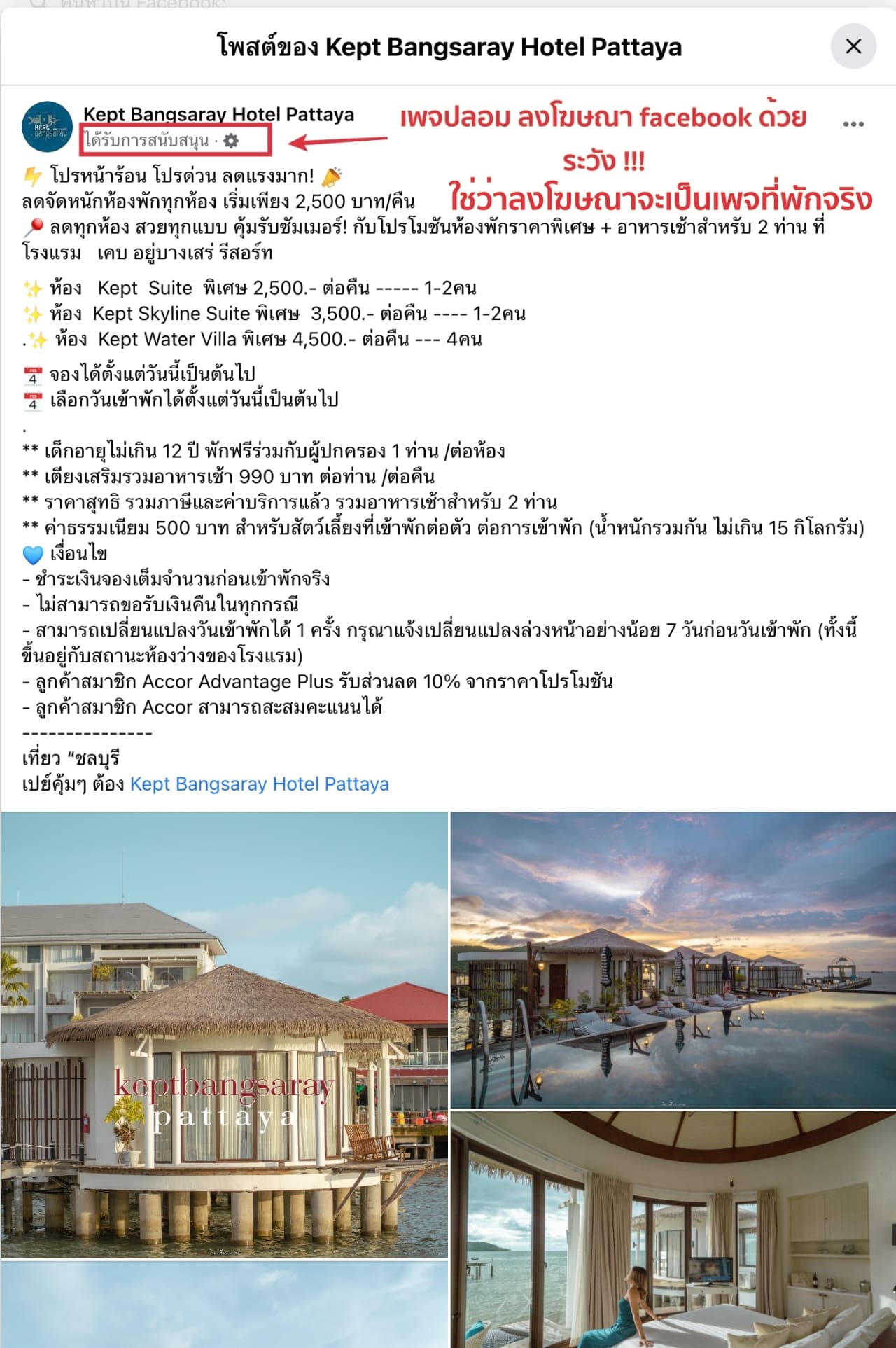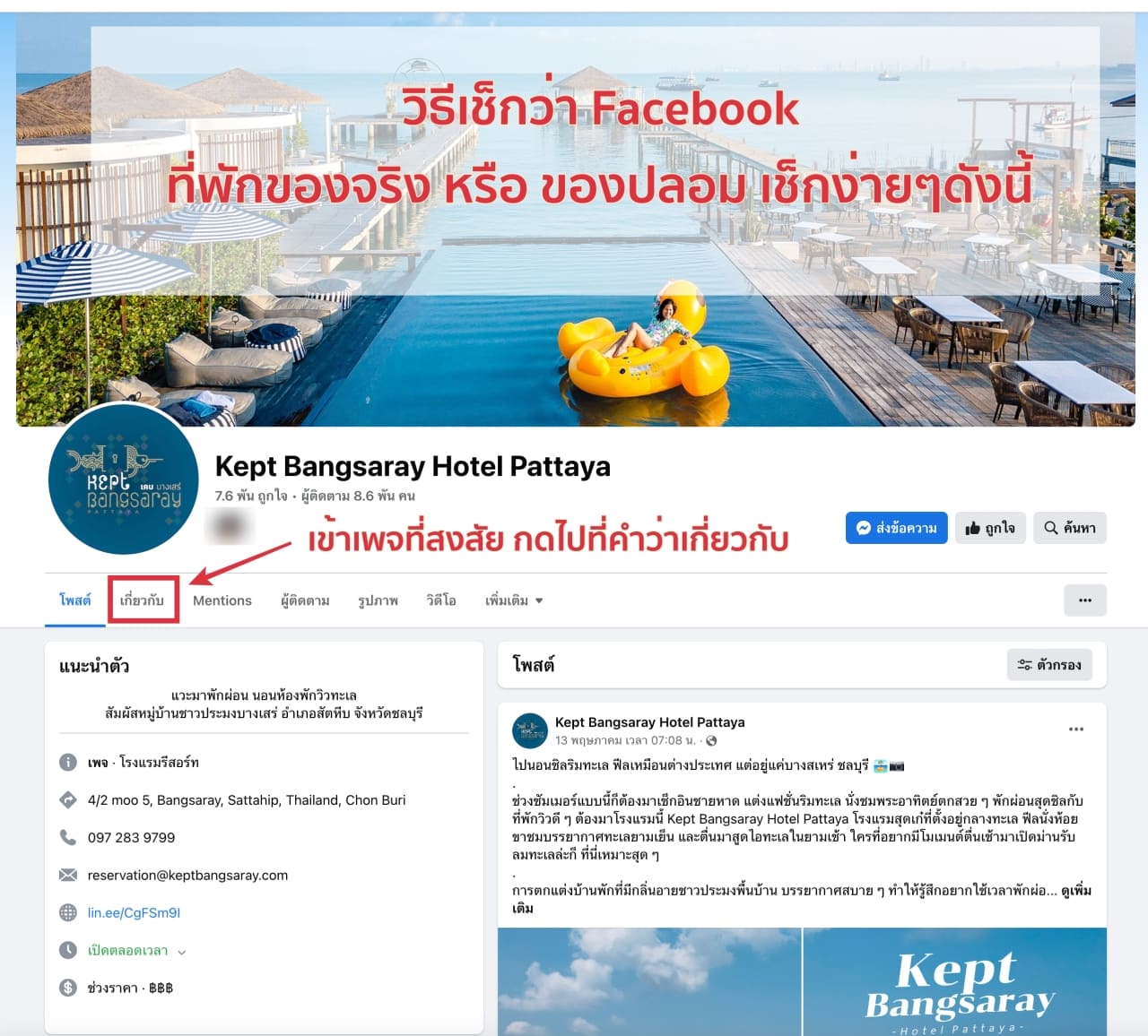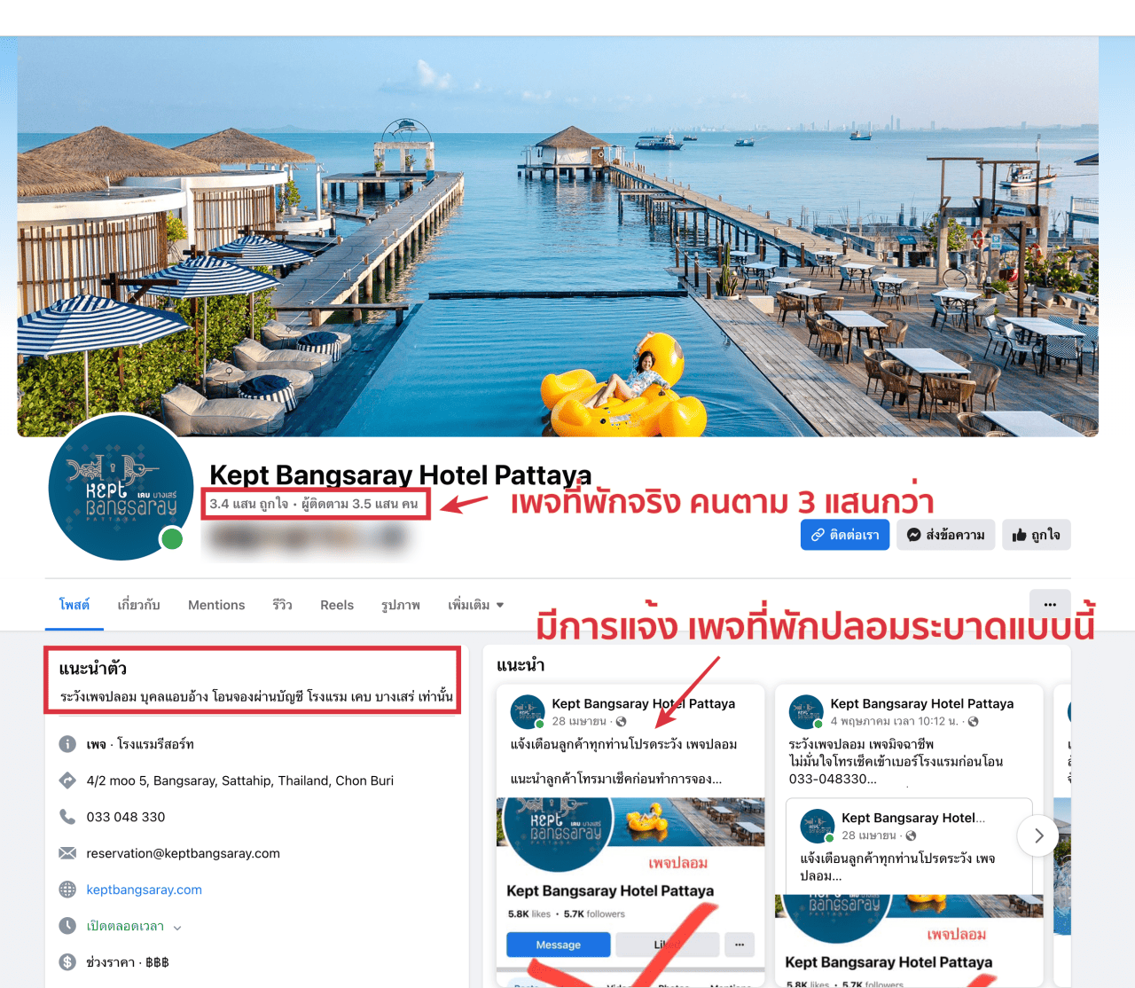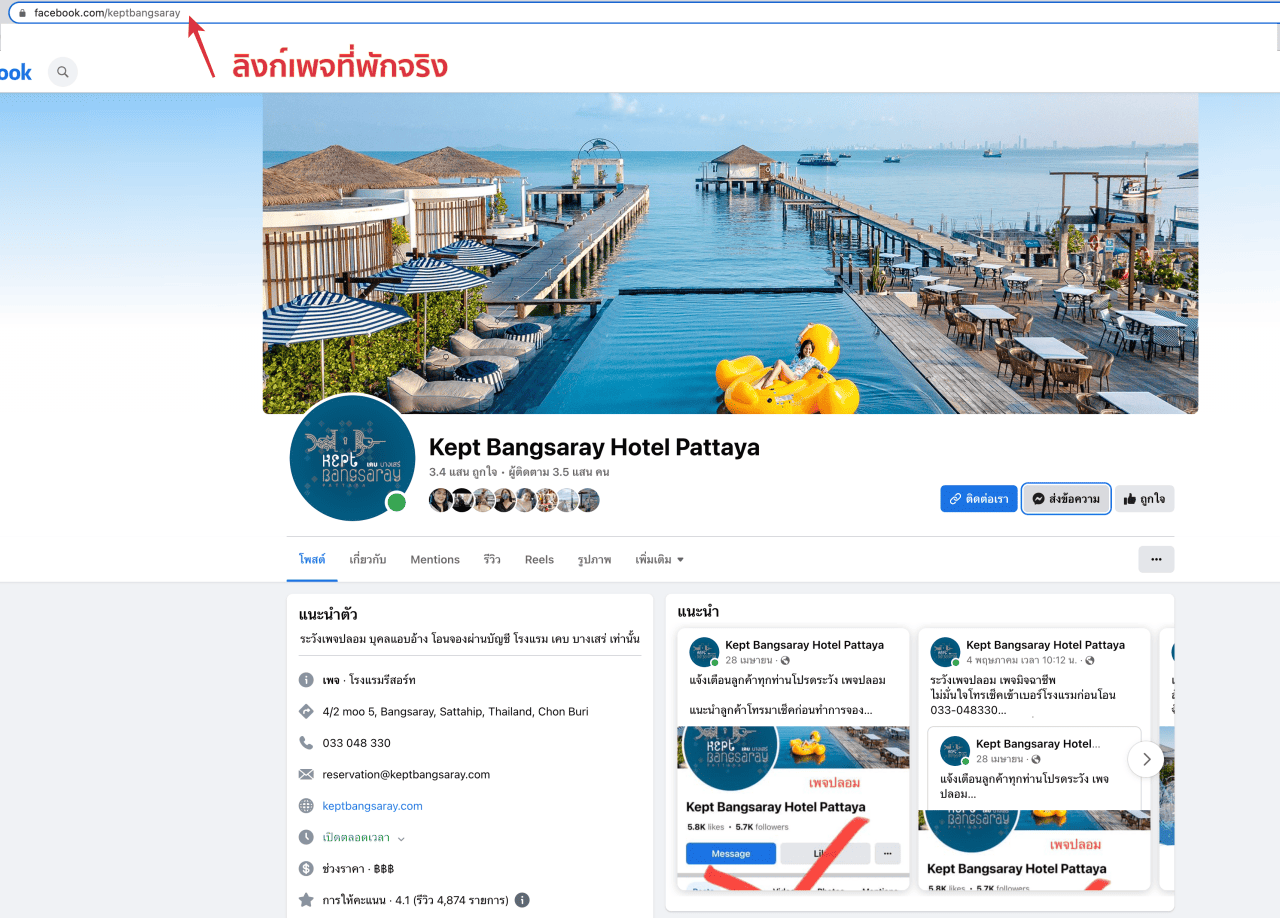ยกตัวอย่าง เพจ ที่พักดัง  Kept Bangsaray Hotel Pattaya ที่มีการปลอมเพจเยอะมากๆ วันนี้มาดูกัน