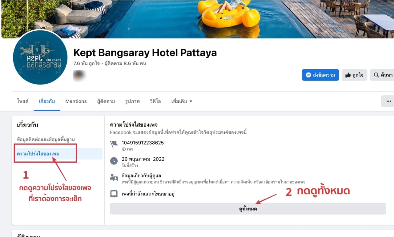 1. ไปที่เพจที่พัก หรือ เพจที่เราสนใจซื้อสินค้า  แล้วไปกดที่ เกี่ยวกับ ตามภาพ ในเพจ