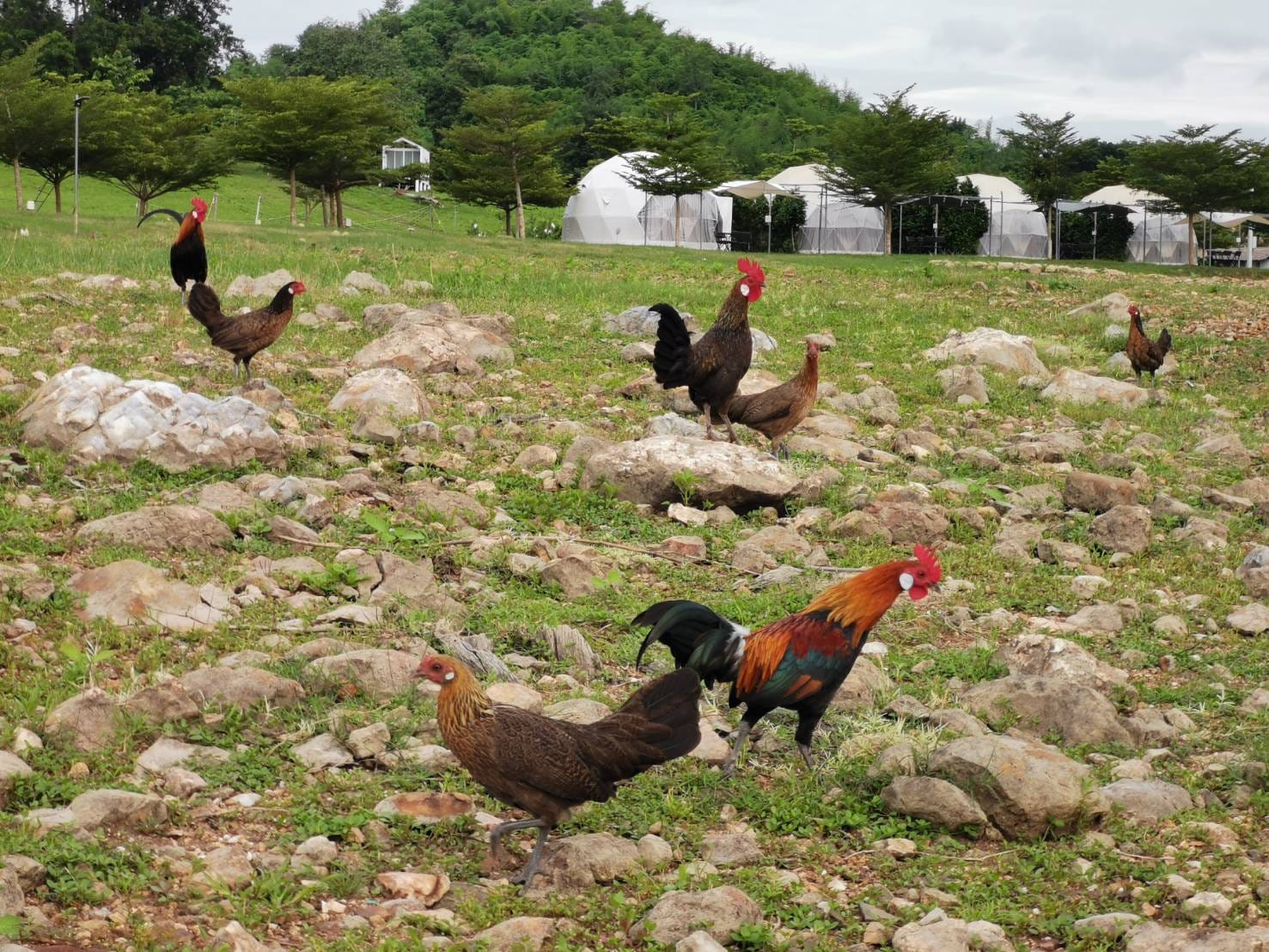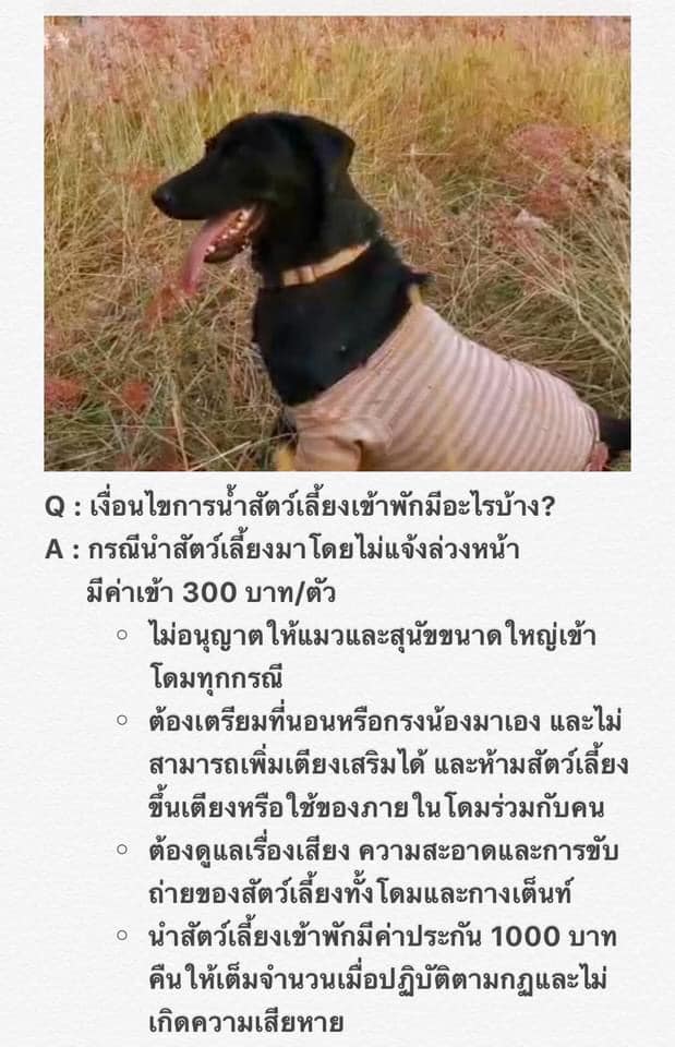 สัตว์เลี้ยงเข้าพักได้ อนุญาตให้น้องหมาพักได้ แต่เฉพาะสุนัขขนาดเล็ก เข้าพักได้ฟรีโดมละ 1 ตัวโดยต้องแจ้งล่วงหน้า แต่ถ้าลูกค้านำเต๊นท์มากางเองสามารถนำน้องหมาตัวใหญ่หรือแมวมาพักได้ กรณีนำสัตว์เลี้ยงมาโดยไม่แจ้งล่วงหน้า มีค่าเข้า 300 บาท/ตัว * ไม่อนุญาตให้แมวและสุนัขขนาดใหญ่เข้าโดมทุกกรณี